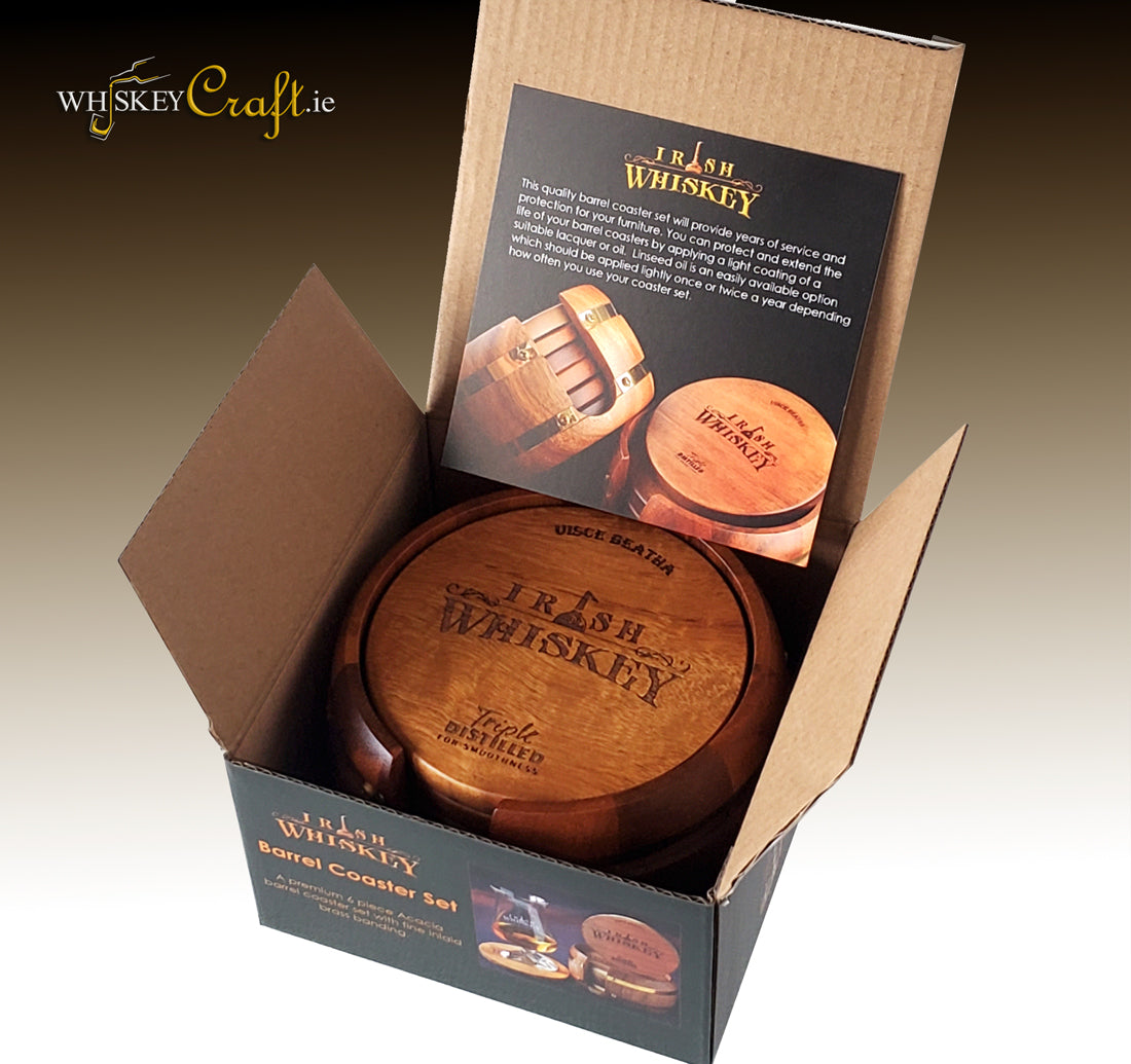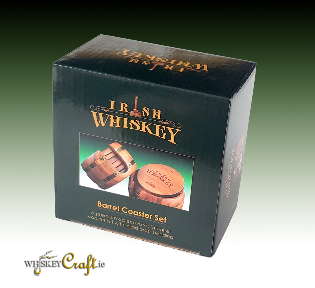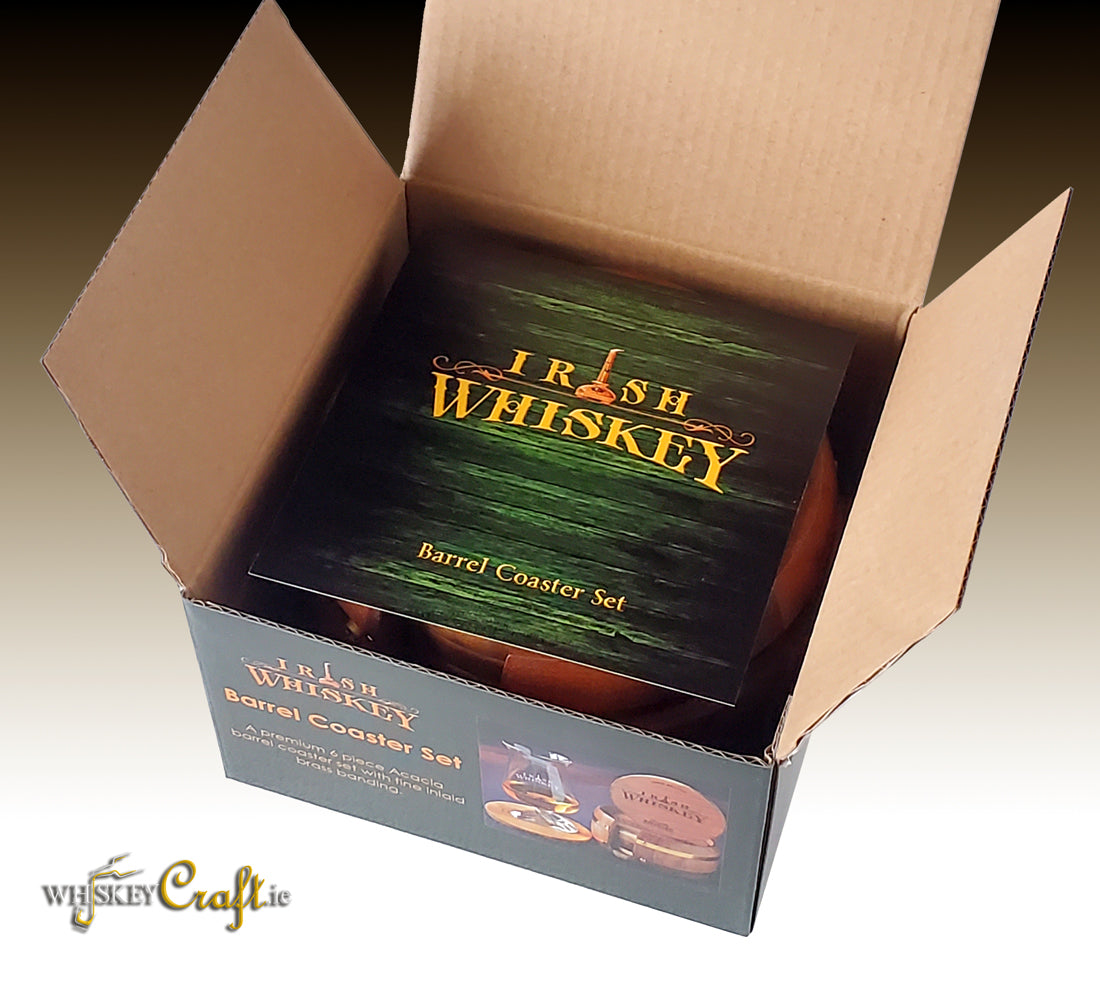 This unique set has been designed and manufactured by Whiskey Craft to reflect truly unique quality craftsmanship. The uniquely curved barrel style coaster holder sits 6 engraved Acacia coasters. Two double outer inlaid brass bands add a quality touch to this premium finished set.